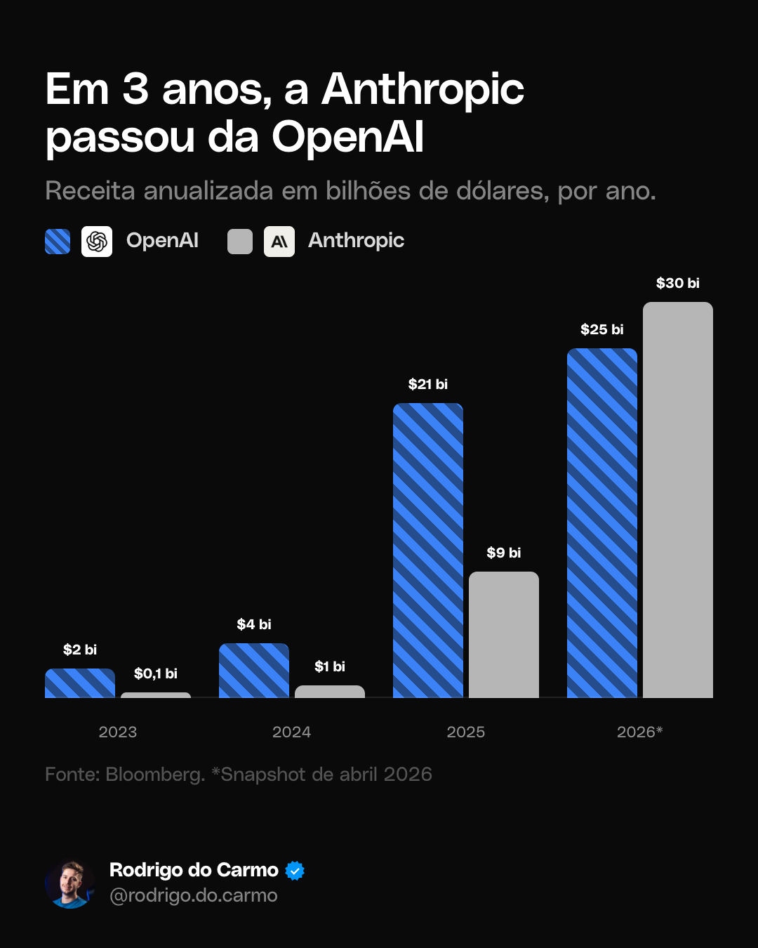 A Anthropic atingiu US$ 30 bilhões de receita anualizada em abril e, pela primeira vez, passou a OpenAI, que está em torno de US$ 25 bilhões. O crossover aconteceu meses antes do esperado: o Epoch AI projetava o cruzamento só em agosto.